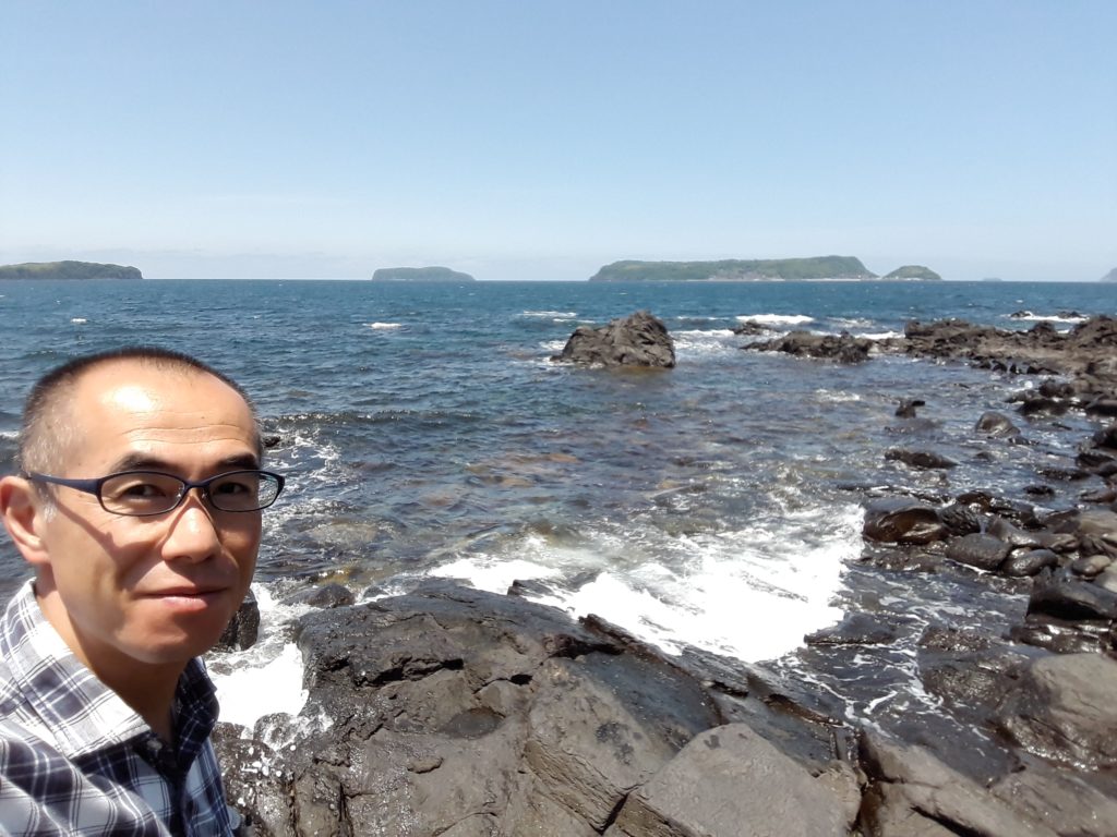 最初は、笠山の突端の虎ヶ崎です。約1万年前に流れた溶岩(安山岩マグマ)の黒い色と美しい海がGOODですよね。