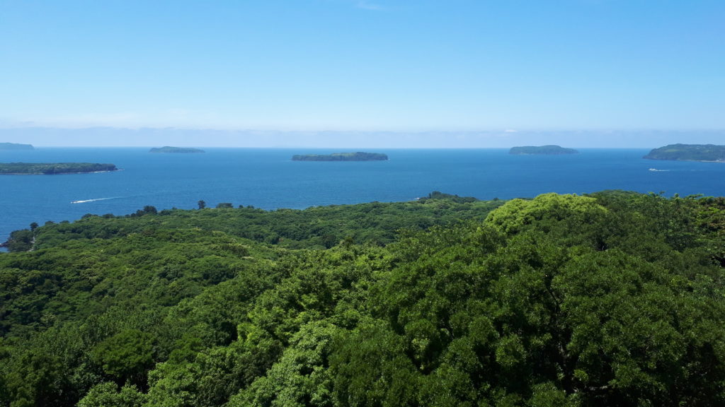 続いては、笠山の展望台から見た萩六島(右から大島、櫃島、肥島、尾島、羽島、相島)です。いつもよりワイドに撮ってもはみ出してしまったけれど、訪れた人はみな歓声をあげていました。