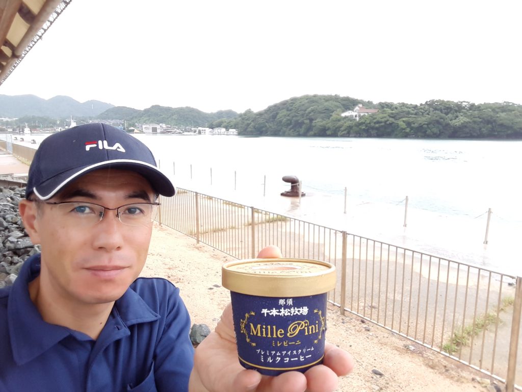 自宅から徒歩100m、海辺のデッキ(ただしくはイベントステージですが。)で、いただいちゃいました!山口県萩市に住んでいるからこその「ふるさとの牧場の味を取り寄せて萩の海辺で味わいにけり」という心境ですね。…失礼いたしました!