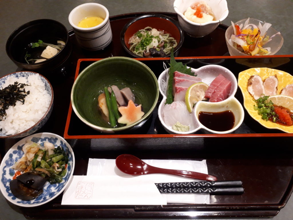 東萩駅のすぐ隣に、旅行の時によく利用していた「萩ロイヤルインテリジェントホテル」があります。ホテルは3階から上で、1階と2階はテナント階になっています。その2階の一角にある「だいにんぐまめだ」は、宿泊の際には夕食の飲み食いをしていたお店です。