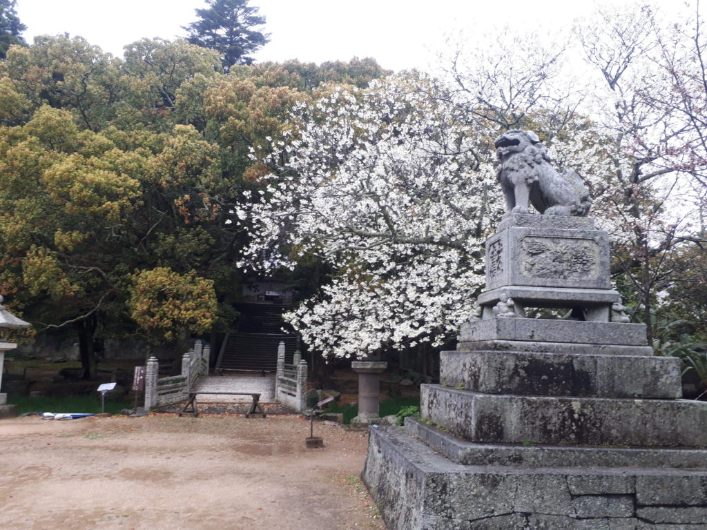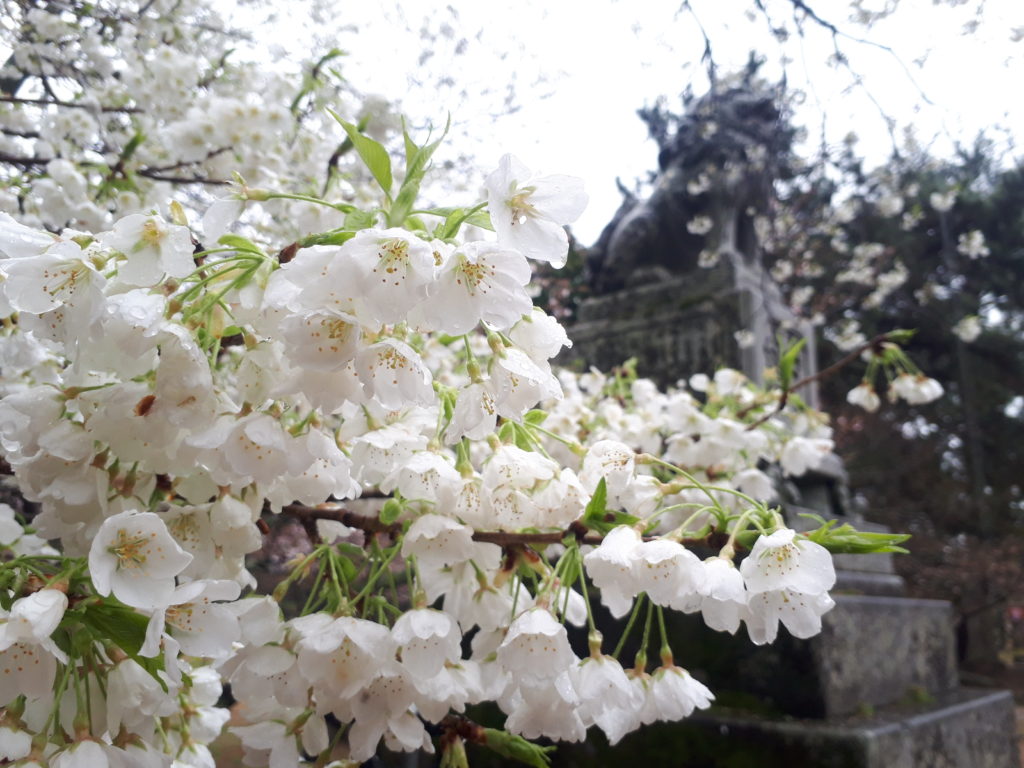 特徴として、ソメイヨシノに似ているものの萼(ガク)の色が赤色ではなく緑色であること、花がナシ類のような純白色であることなどが挙げられます。昭和56年に山口県の天然記念物に指定されていて、推定樹齢は100年あまりとのことです。