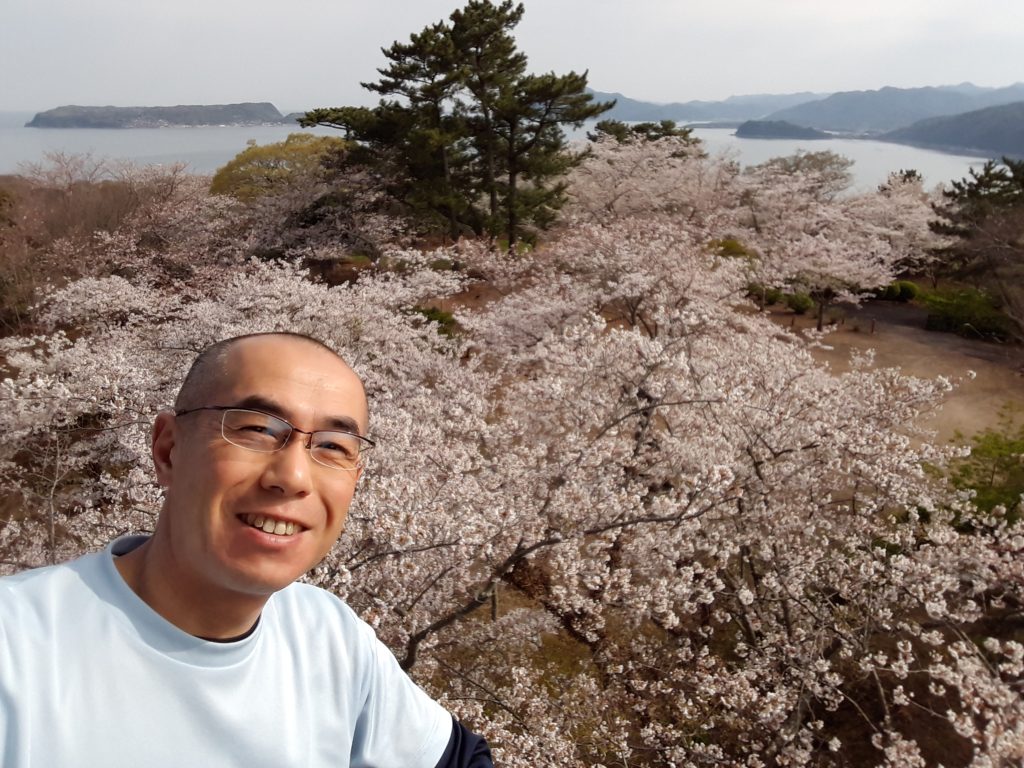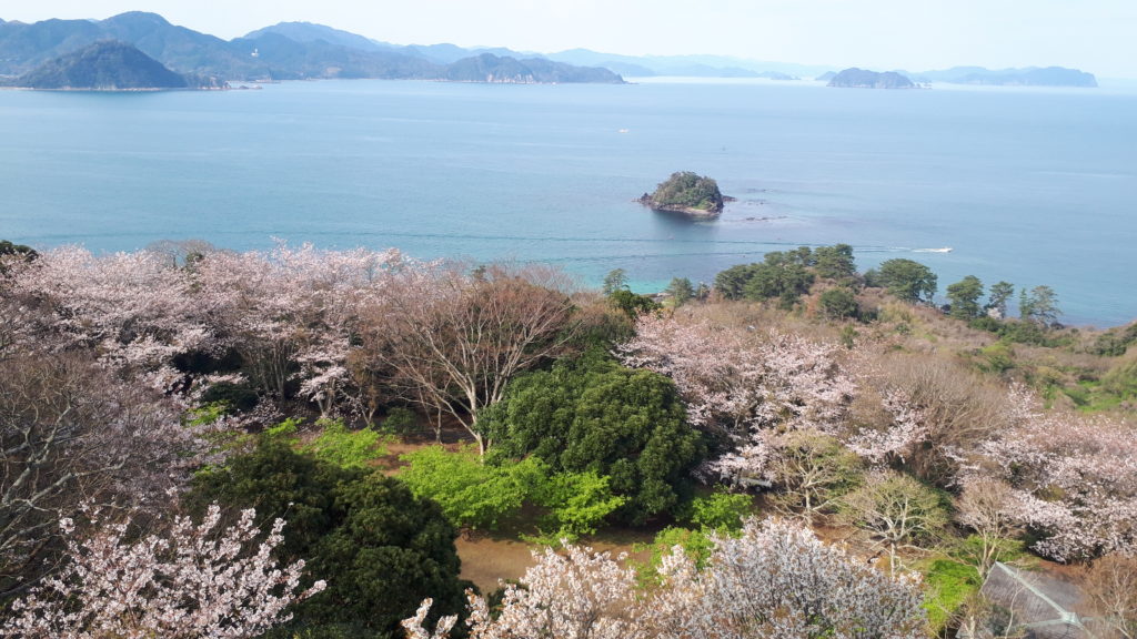 満開には少し早いけれど、見ごたえは十分。一段高いところに建つ展望台の三階から眺めるので、枝を張った桜の木々を見下ろすことができるし、周囲の海や島々も含めた眺望はひと味違います。