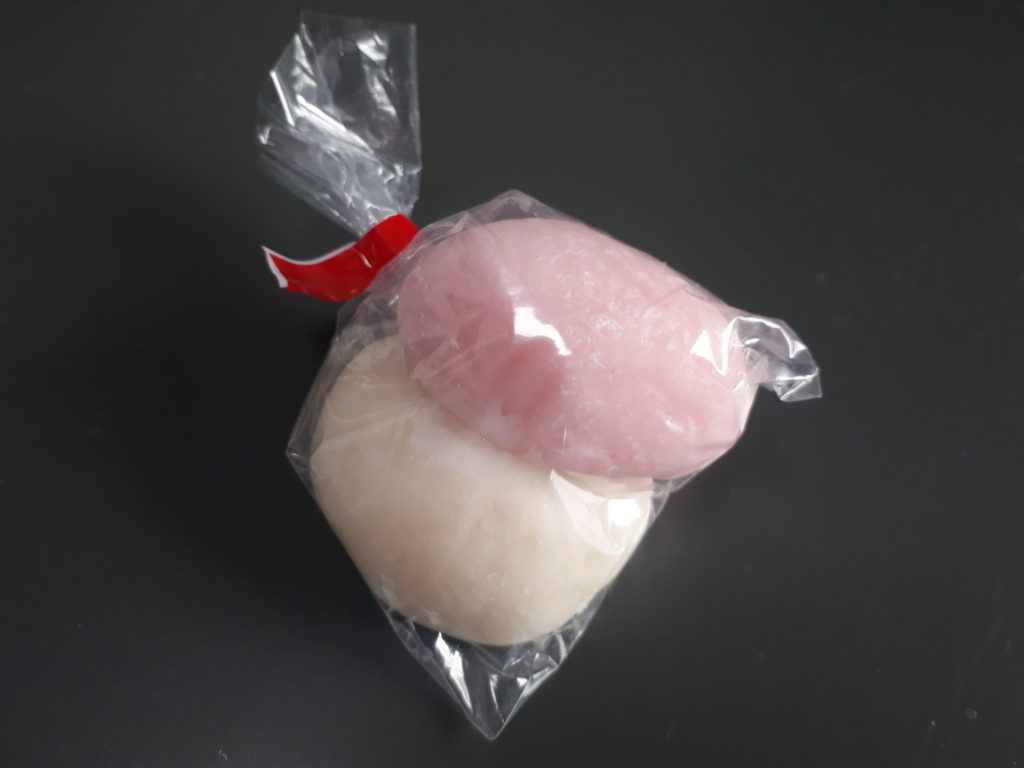 そして、町内会員には写真の紅白餅が配られました。やわらかいうちにさっそくということで、一日も早いコロナウィルスの収束や自身の息災などを願いながらいただきました。