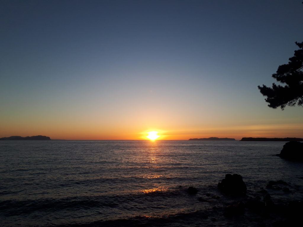まあ、結果としては、薄く雲がかかっていたので、写真のとおりです。十分に美しいですよね。太陽の右の島が「相島」、そして「羽島」です。羽島が手前なので大きく見えますが、相島の方が広くて有人島です。相島といえば、スイカ(西瓜)やサツマイモの産地としてもしられ、今の時期はスーパーや道の駅、産直所などで存在感を増しています。