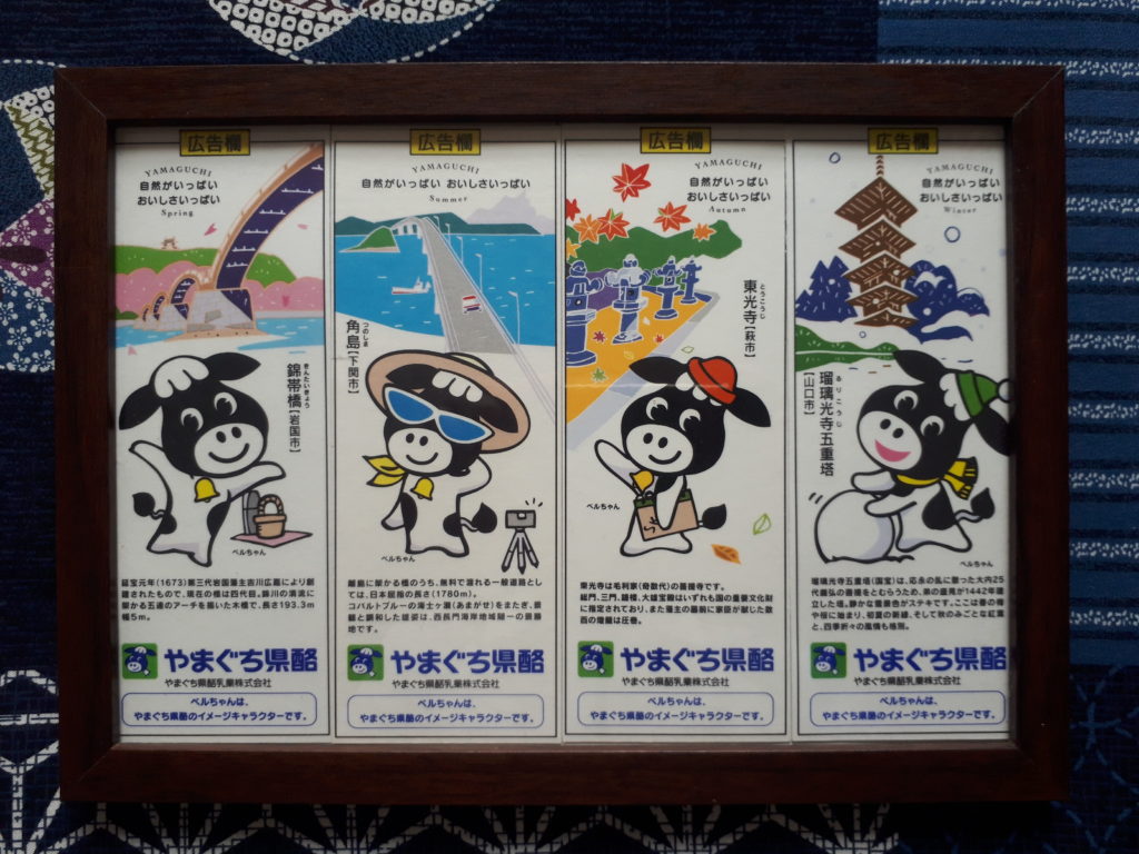 冬の瑠璃光寺(山口市)、春の錦帯橋(岩国市)、夏の角島大橋(下関市)、そして秋の東光寺(萩市)。これはコレクションしてみたい!と、マニアックな野望を抱いて、季節ごとに切り抜きをして保管しておきました。9月に入り、いよいよ秋デザインの販売が始まり、このほど4種類がそろいました。手元にあった写真フレームに入れての記念撮影、やまぐち県酪農さんに投稿したら、何か良いこと起こるでしょうか?