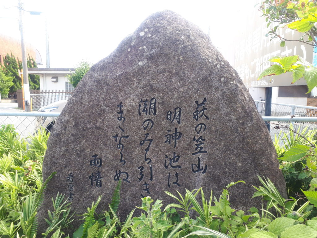 雨情詩碑は、笠山のふもとにある明神池の畔で料理店を営む末武さんが、雨情生誕120周年の記念に平成14年(2002)5月に建てたものです。私の郷里、栃木県の塩原温泉にも縁のある野口雨情が萩を訪れて詩を残していたことが嬉しくて、友人や知人に知らせたくて編集したものをお見せしたところ、とても喜んでくださり話に花が咲きました。