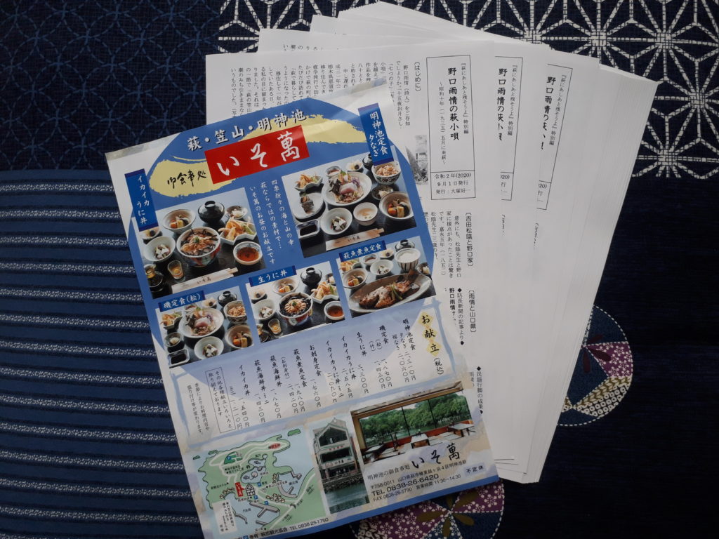 令和2年3月15日(日)、運命だったのかもしれないけれど、私はこの詩碑と巡り合うことができました。それから半年後の9月15日(火)、この一節が含まれる「萩小唄」について調査しまとめたものを出版するに至りました。(もちろん、無料で配られるものです。)A4判の用紙の両面に黒の一色刷りという質素なものですが、作成したものが評価されて出版することになったのですから、私にとっては大きな大きな萩へのあしあとになります。