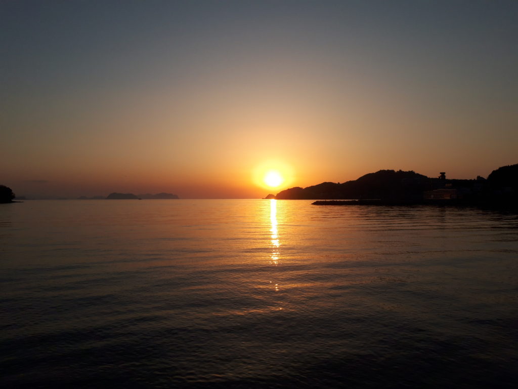 萩マリーナにて。二日間の車移動の末に萩に到着し、初めて迎えた夕方、ちょうど笠山の先端に沈む夕日を目にした。