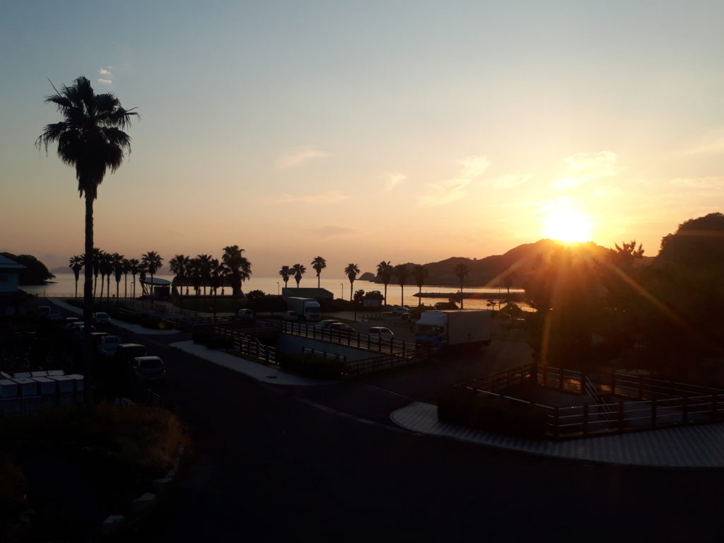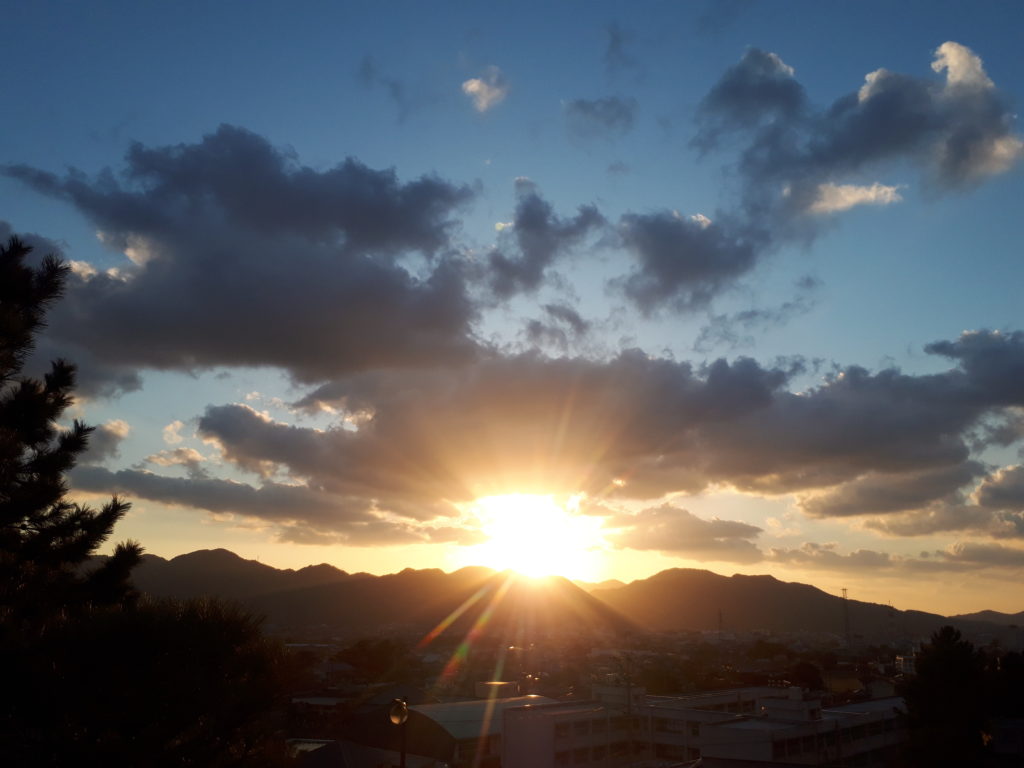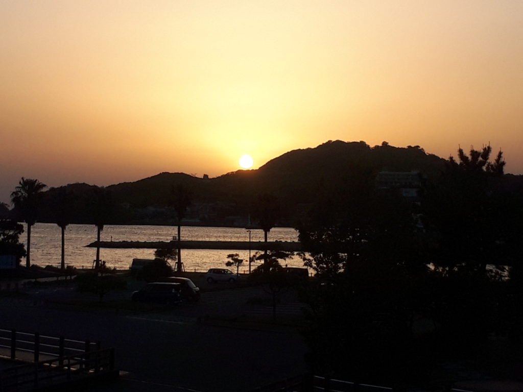 寮にて。笠山中腹に沈みゆく夕日、毎日太陽の沈む位置は異なるのだ。この先もっと右(北寄り)に移動していく。