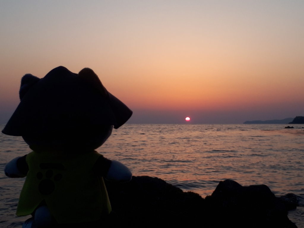 笠山にて。萩にゃん。を連れて海辺での夕日観賞。