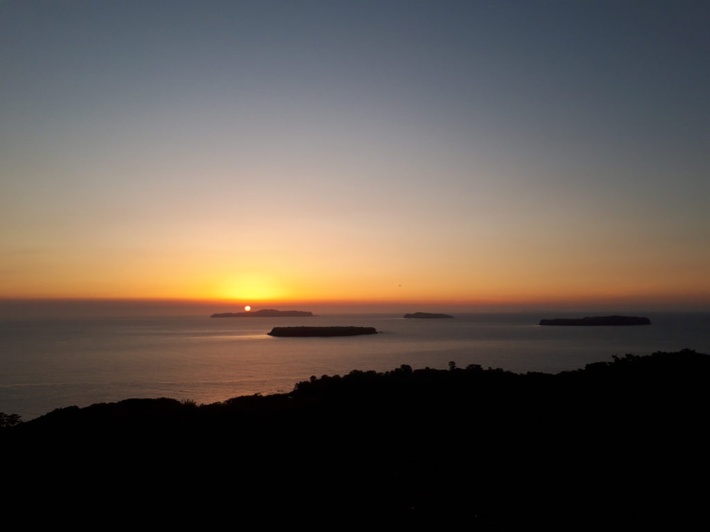 笠山にて。沖合に浮かぶ島々は噴火によってできた溶岩台地で、平たくて愛らしい。この時、夕日は相島の先に沈んでゆく。