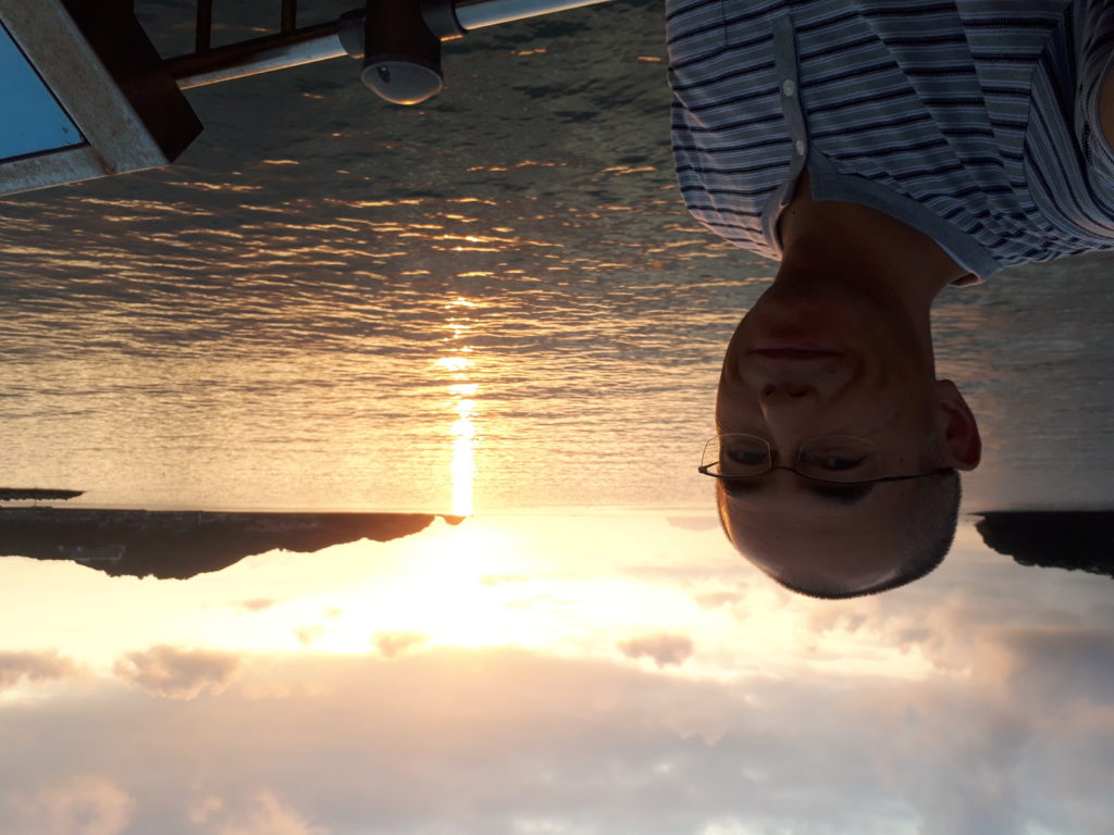 寮にて。すでに日は落ちて、夕焼けの余韻が残っている光景。左に船と3本のマストが写っているのは帆船「みらいへ」。