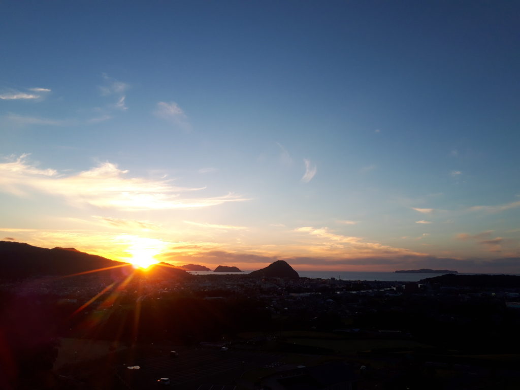陶芸の村公園にて。久しぶりに高台から夕日を眺めてみようと思い陶芸の村公園の展望広場へ上がった。中央に指月山を配すると絵になる。