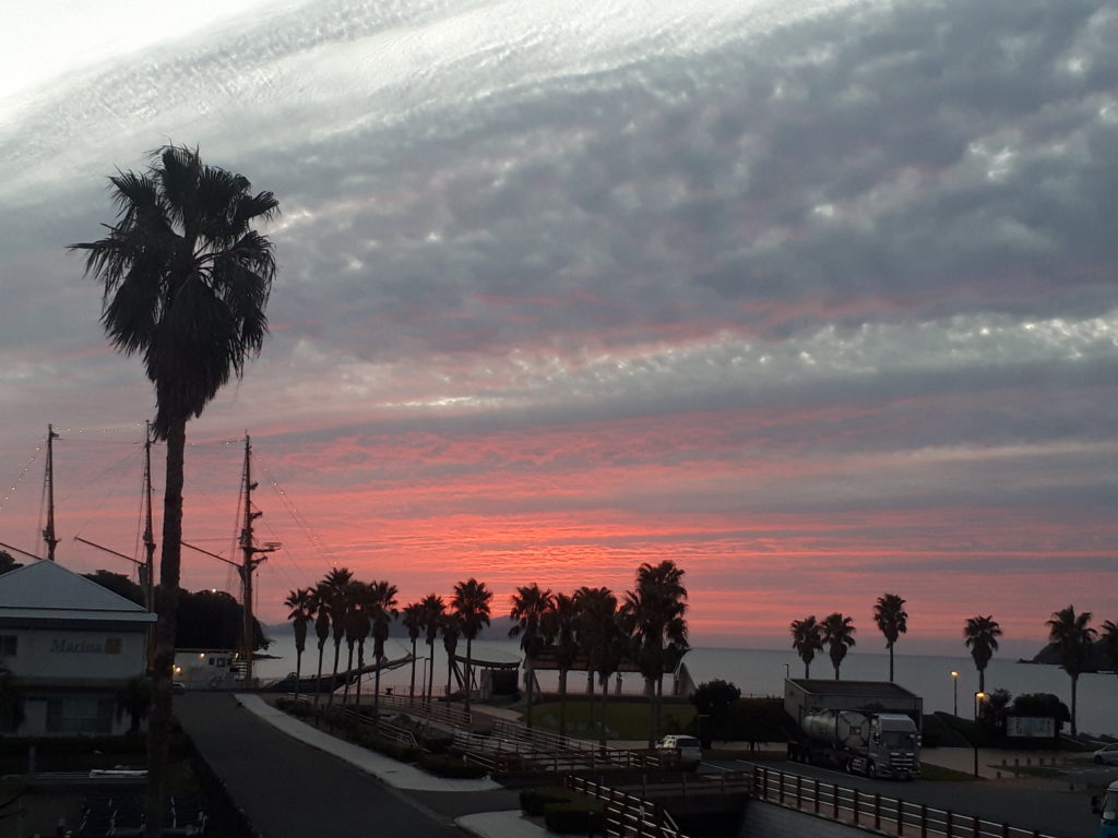 マリーナ萩にて。夕日を見る回数がもっとも多い場所はここ、マリーナ萩。なにせ自宅の目の前だ。右の笠山、左の狐島との間は意外に狭く、この間に日が沈む時期は実は短い。