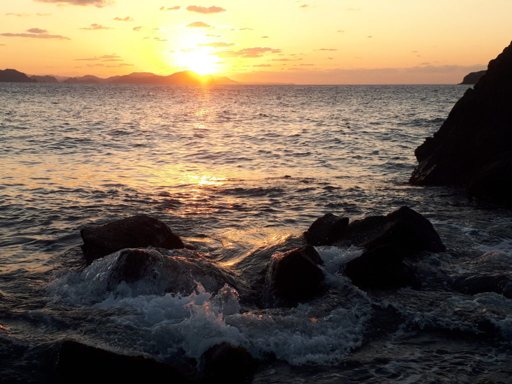 笠山にて。湾内の静かな海に沈むのも良いが、岩と波とがあると夕日の印象は変わるものだ。急に荒々しく見えてきたのは黒い溶岩のおかげ。