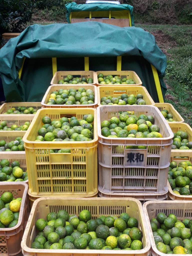 この柚子山は自社所有地で、おそらく200本程度の柚子が植えられています。10月中はなるべく青い実を狩るように指示され、11月に入ると黄色になったものも含め総採りをしていきます。木の外側から見える実も、下に入ってしまうと枝葉に隠れて見にくくなり、また高枝切りも伸ばしにくくなってしまいます。「収穫」も楽なものではないということを身に沁みて経験するよい機会だと私は思うのです。