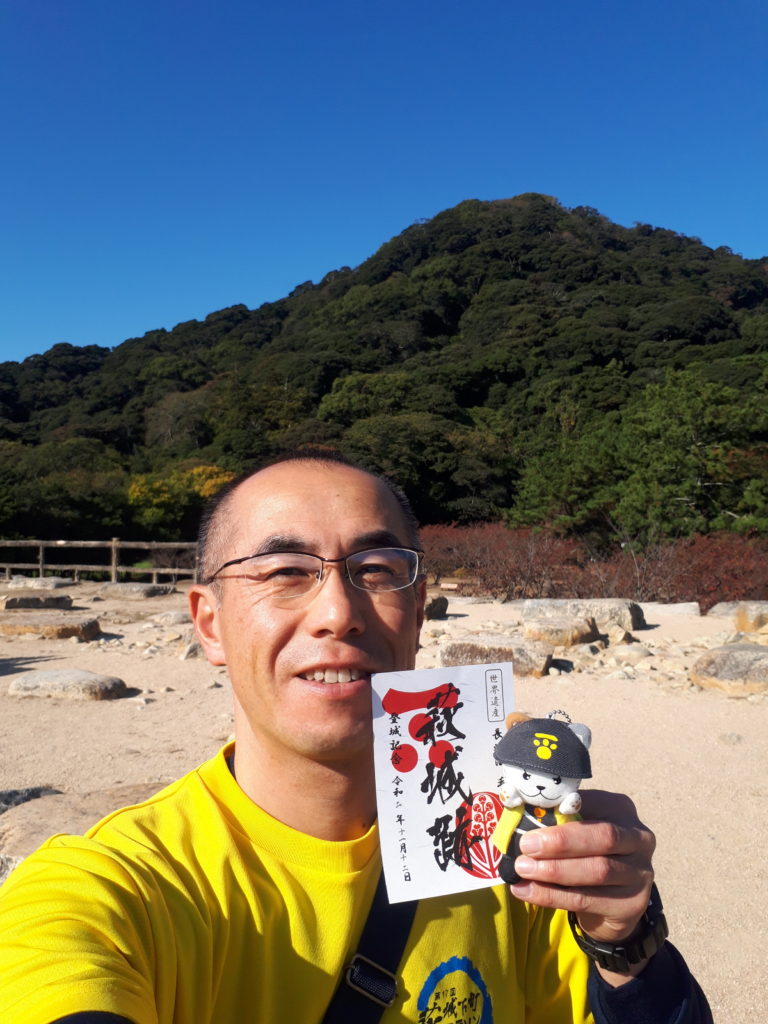 天守台で、指月山を背景に「忠義の猫 萩にゃん。」との記念撮影。