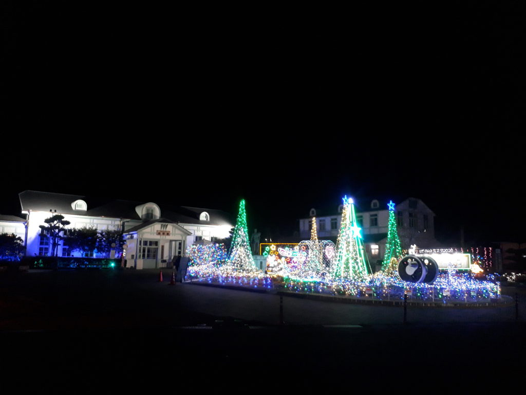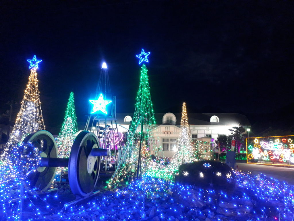 ロータリー内側の庭園には、鉄道の父:井上勝の銅像が建っていますが、この写真では主役を奪われてしまっています。手前に、鉄道の車輪をイメージしたモニュメントがあるのはご確認いただけるでしょう。イルミネーションの色合いは変化しますし、駅の周りのご近所さんも演出に協賛されています。