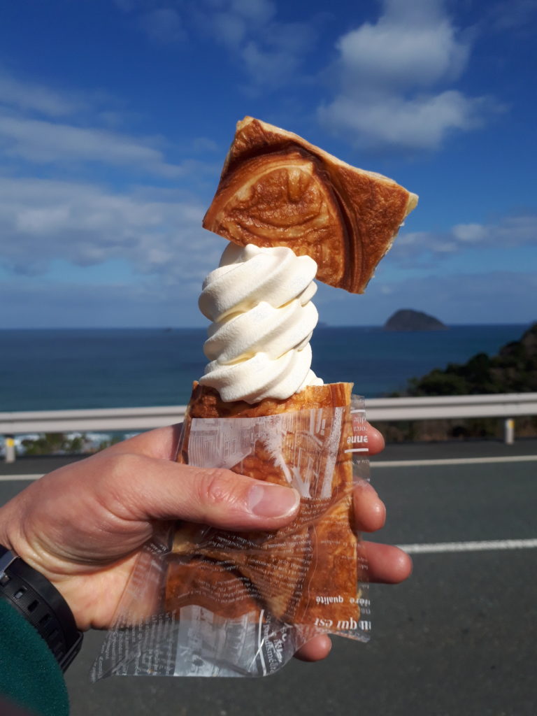 さて、ちょっとしたお目当ての品はこちらです。さんさん三見の人気商品であるクロワッサンたい焼きの生地をソフトクリームのコーン代わりに使用した『クロたいソフト』が新発売となりました!見た目にインパクトがありますが、持つのに不安定そうです…というほど持ちづらさはありません。クロワッサン生地とソフトクリームの相性もなかなか良いものです。