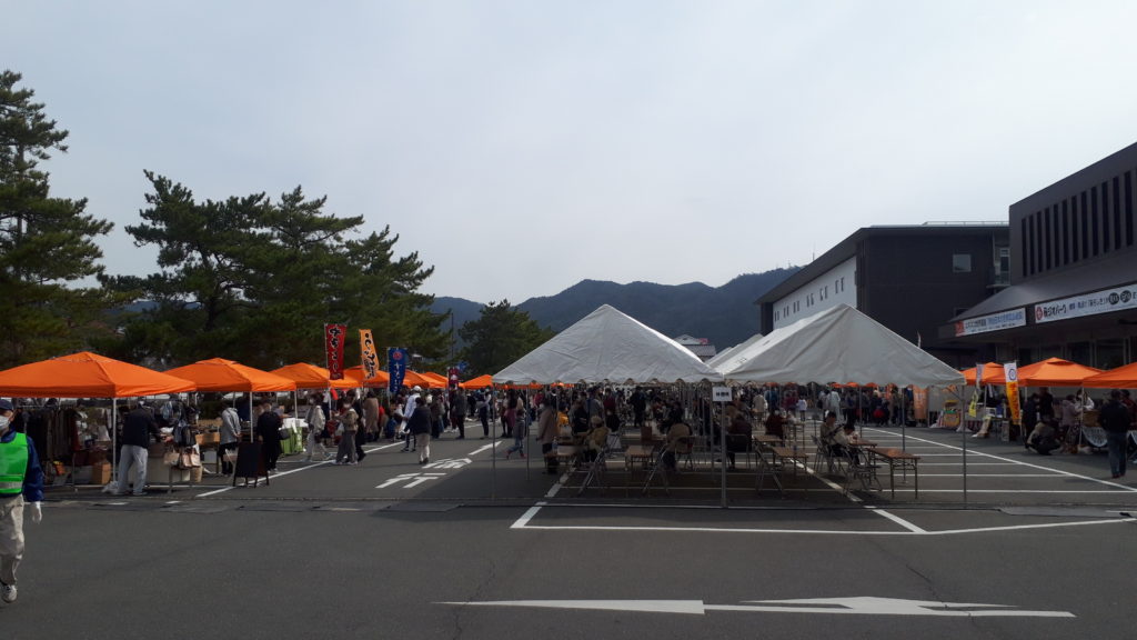 令和3年3月7日(日)、萩市役所と総合保健福祉センター前の駐車場を利用して「がんばろう萩!ふるさと応援フェア」が開催されました。大規模とまでは言い切れませんが、新型コロナ感染症が広まってから久しぶりの大きなイベントでした。約20のテントが並んで、ご飯もの・粉もの・飲み物・野菜・雑貨などが販売されました。
