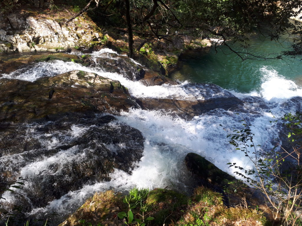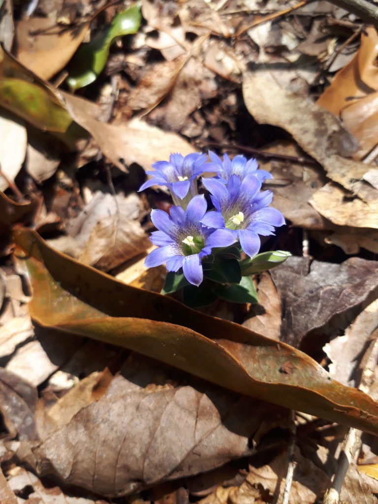 木々も芽吹き始めたばかりで、晴れたこの日は林床も明るく、足元にはフデリンドウが可愛らしく花を咲かせていました。川の流れに沿い、少しずつ水音が大きくなってくると、チラリと滝らしきものが上流に見えました。