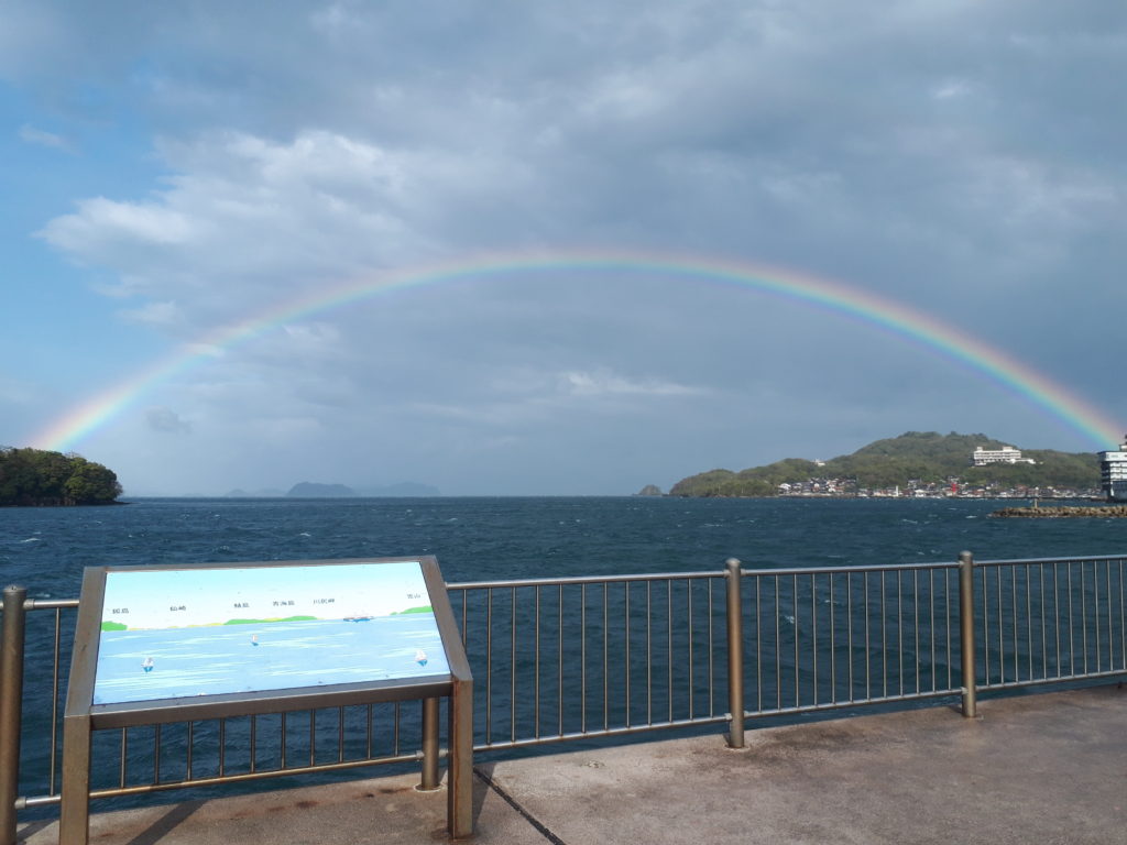令和3年(2021)4月13日、山からの朝日がもう少しで出る頃に、西の空に美しい虹がかかりました。右側の笠山と左側の狐島(美萩台)とをつなぐようなアーチとなり、しばらく楽しませてもらいました。ちょうど右端に映っているのが萩小町という宿泊施設です。以前、ここに泊まったことのある知人にも、撮った写真をLINEでプレゼントしました。