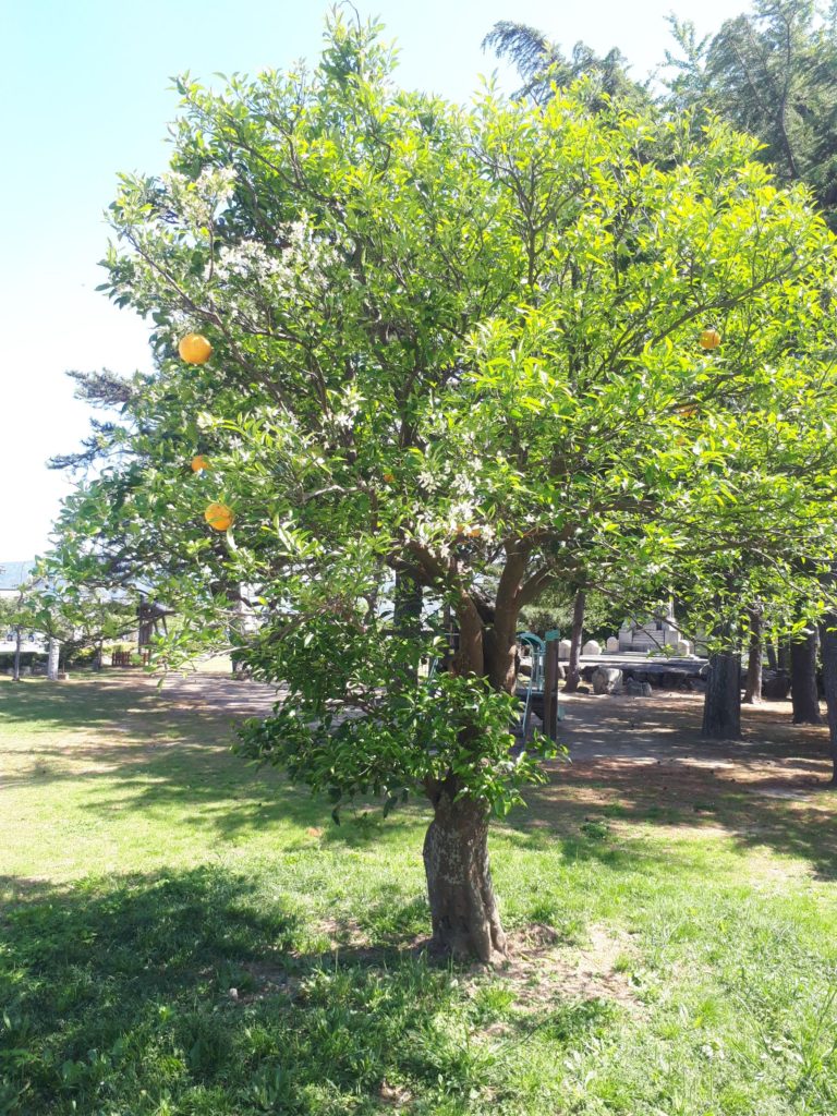 さて、萩博物館に隣接して、第26代内閣総理大臣を務めた田中義一の銅像が建つ公園がありますが、ここには夏みかんんの古木があります。市内でも最古級だと聞いたことがあります。少々見づらいと思いますが、今年も花をたくさん咲かせており、まだまだ元気な様子が伺えます。