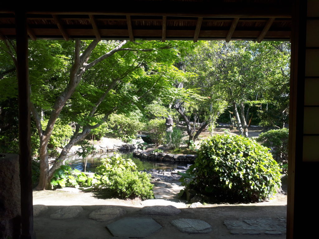 その後、久しぶりに旧湯川家屋敷に行ってみることに。市内を流れる人口の川「藍場川(あいばがわ)」の最上流部に建つ屋敷です。敷地内に水を引き込んで、庭園内の池に使ったり、建物の下を流して台所で洗いものに利用したり、別な場所には風呂場を設けたりと、様々な用途で川水を使っていた様子を見学できます。