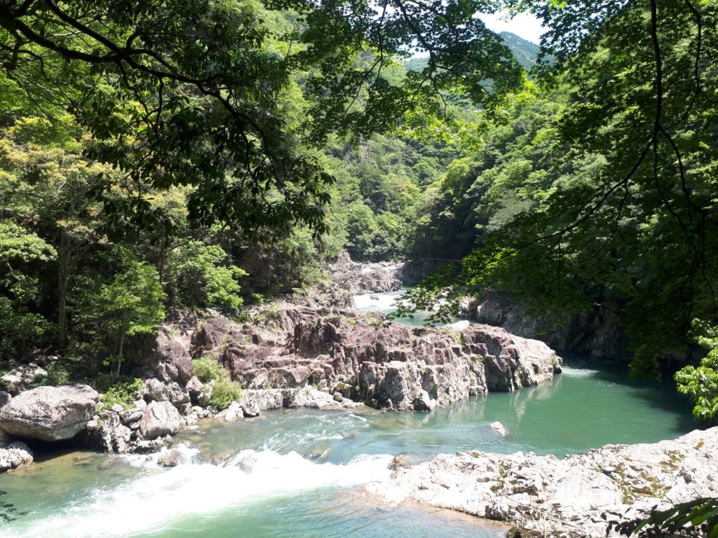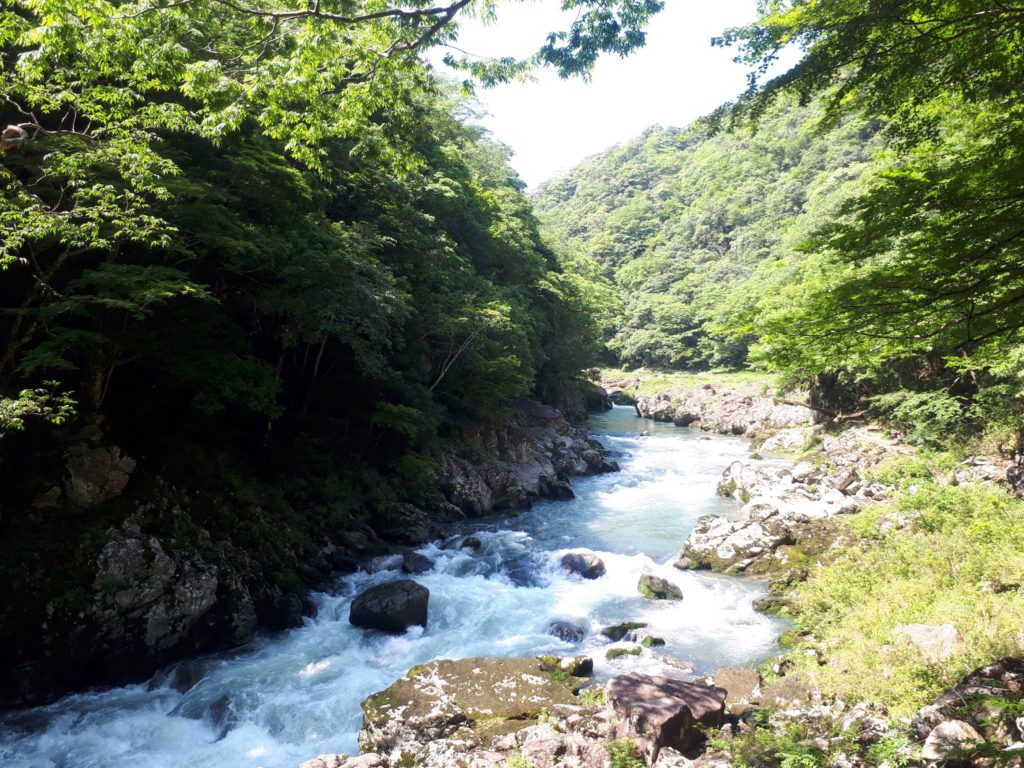 歩き切った先は、丁字川出合淵(ていじがわであいぶち)となります。写真上では分かりにくいかもしれませんが、手前から流れる川と、奥から流れてくる川とが出合い、合流して左に流れて行きます。ちょうど「丁」の形です。