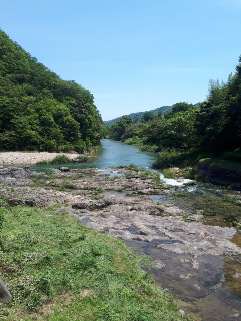 雨のおかげで、木々の緑はますます輝き、川の水量も多くて涼感抜群です。萩市側の入り口である竜宮淵を起点に、片道5.3㎞の川沿いの歩道を往復、片道はだいたい1時間15分といったところでした。紅葉シーズンには特に注目を集める長門峡ですが、この快適な初夏の時期には意外と人が少なめのようです。もっとも、現在はコロナ禍の中にあるので、アウトドアとはいっても訪れるのを控えているのかもしれませんね。