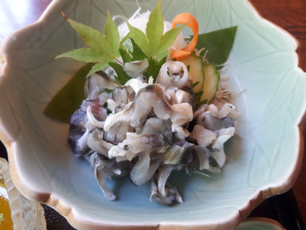 今回のお楽しみは食事でもありました。竜宮淵に建つその名も「竜宮茶屋」というお食事処での鮎料理を堪能しました。以前食べた鮎定食よりワンランクアップして「竜宮定食」です。塩焼き・背ごし・うるか・甘露煮、さらに天ぷらもあり、たまらないおいしさでしたよ。まだ若鮎ということで小さいため、塩焼きが3尾並んでいるのが可愛いし、頭まで柔らかでした。新鮮な鮎を骨ごと輪切りしたという「背ごし」は初めて食べましたが、これはおいしいですね。また食べたいです。