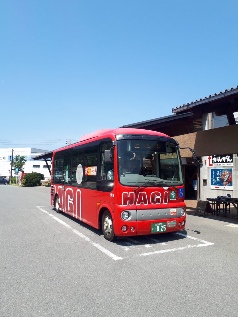 運賃は1回100円で、車内で入手できるカードなら1日乗り放題500円、2日間乗り放題700円です。今日はバスの写真を撮りたかったので、萩しーまーとで待ち伏せし、バスの到着を待ちました。乗車のためじゃなく撮影のためでした。悪しからず。