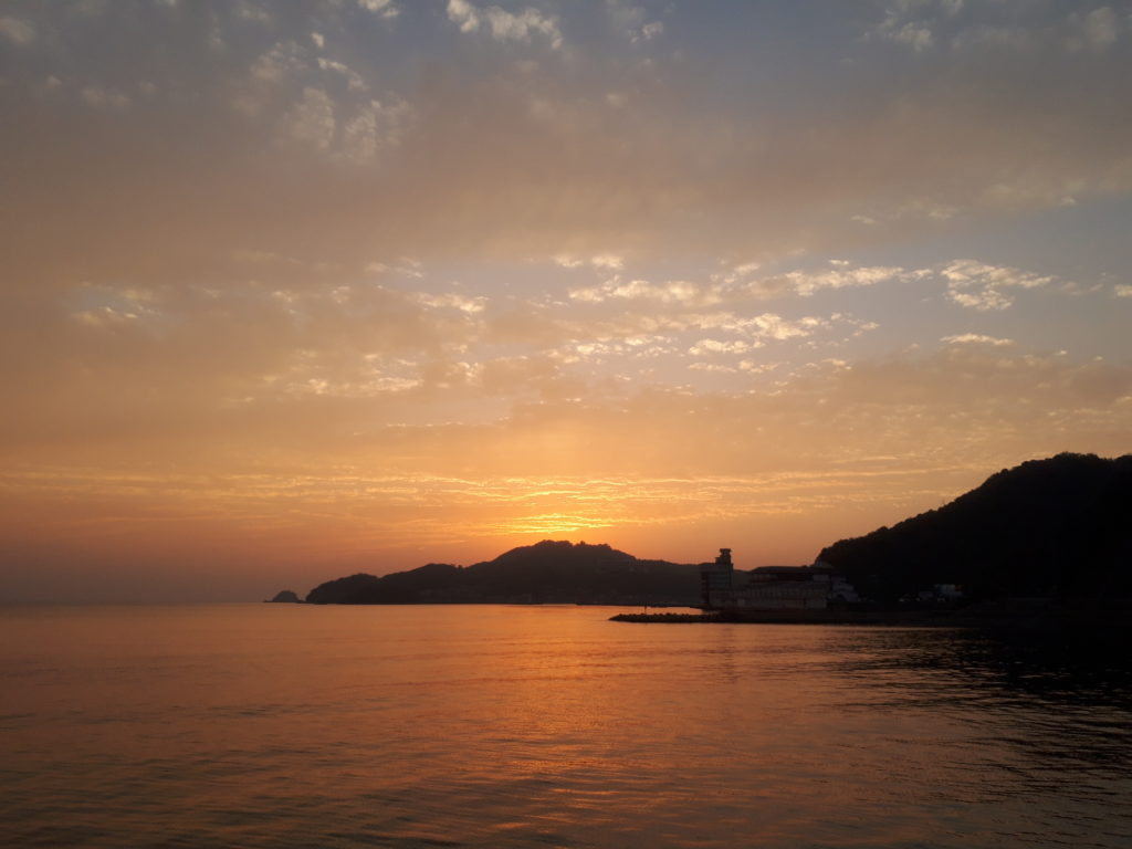 令和3年(2021)6月21日、夏至です。出勤のため、早朝の活動はせず、夕景を写真に収めることにしました。やや部屋を出るのが遅れてしまい、太陽はちょうど笠山の陰に隠れてしまったところでしたが、雲があかあかと染まっていたのでなかなか良い写真となりました。日の入り時刻は午後7時30分ですが、この写真は20分に撮影したものです。