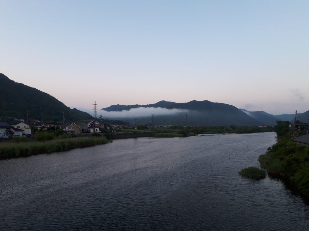 立っている場所は松本川に架かる松陰の大橋の上です。そこから上流方向を眺めている訳ですが、萩三角州を形成する松本川と橋本川が分かれる前(上流)は阿武川で、この霧は阿武川の流れに沿って山の間から湧き立っています。夜から朝にかけてもそれほど低温とならない空気の中に、阿武川上流にある長門峡の渓谷から下って来る冷たい空気が流れ込んで霧が発生するのでしょう。