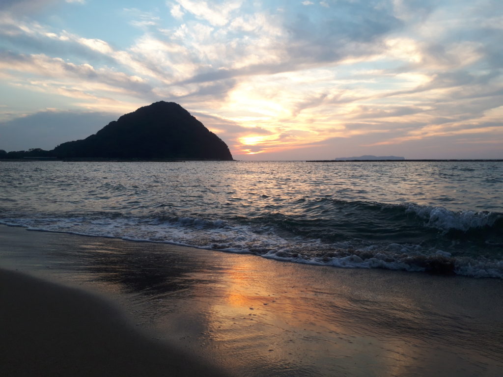 西に雲が多いけれど、それでも夕日は夕日ならではの光景を生み出してくれます。ここは菊ヶ浜で、左の山は指月山、沖の平たいのは相島です。寄せては返す波が、砂浜を濡らして空よりもオレンジ色を濃く映してくれました。
