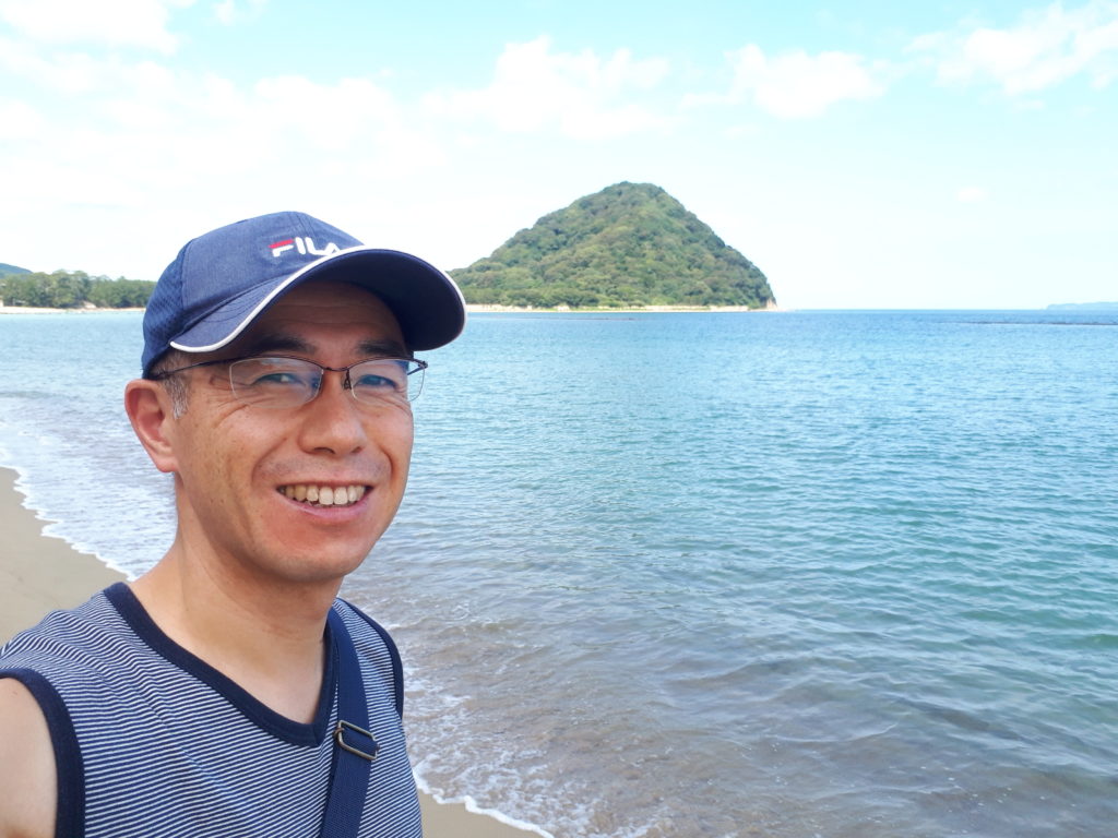 「お約束」という感じの自撮りです。指月山がぽっかりと浮かんでいるように見えますね。菊ヶ浜海水浴場開き、今年は7月17日(土)が予定されています。