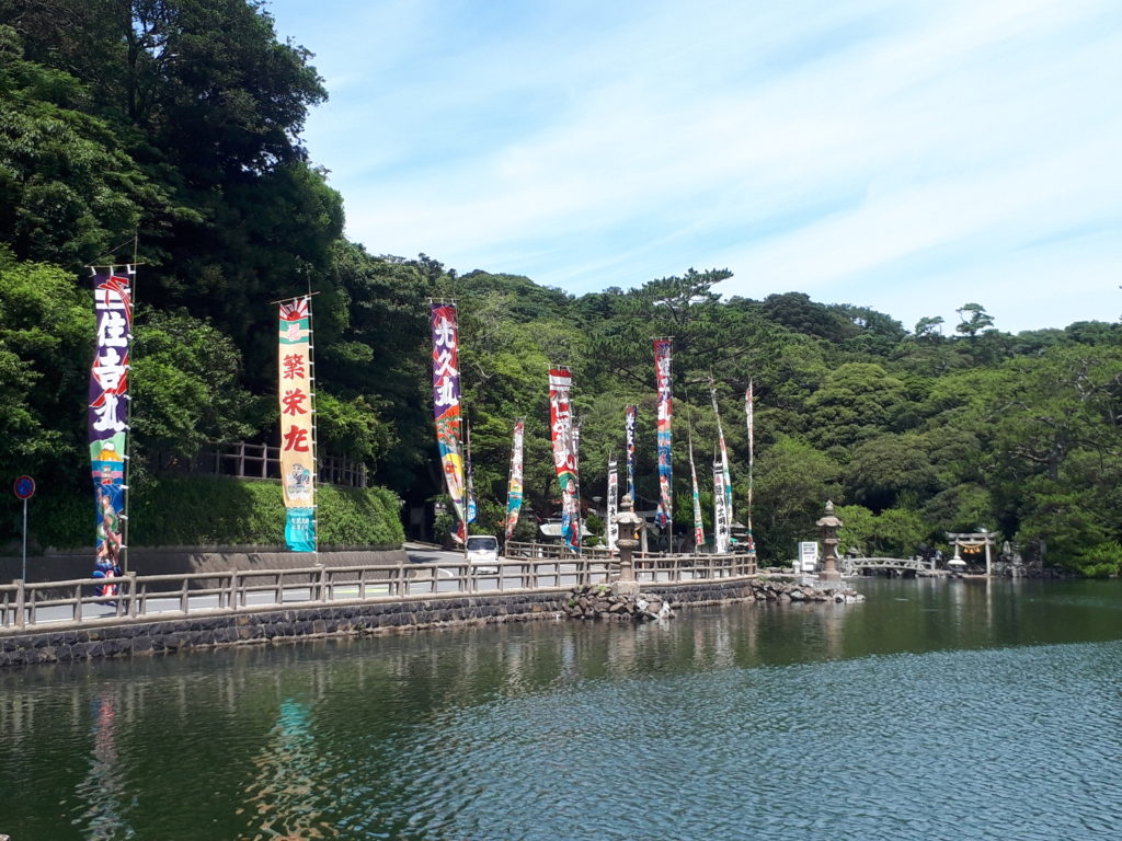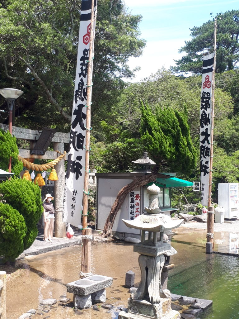 この日は前日の24日(土)に風穴を訪れた時の写真で、祭りを前に参道に大漁旗が並ぶ光景が私には珍しくて撮影したものです。漁港として栄えてきた越ヶ浜らしさを感じました。そして、目の前の明神池の周りにも立派な幟(のぼり)が掲げられていました。