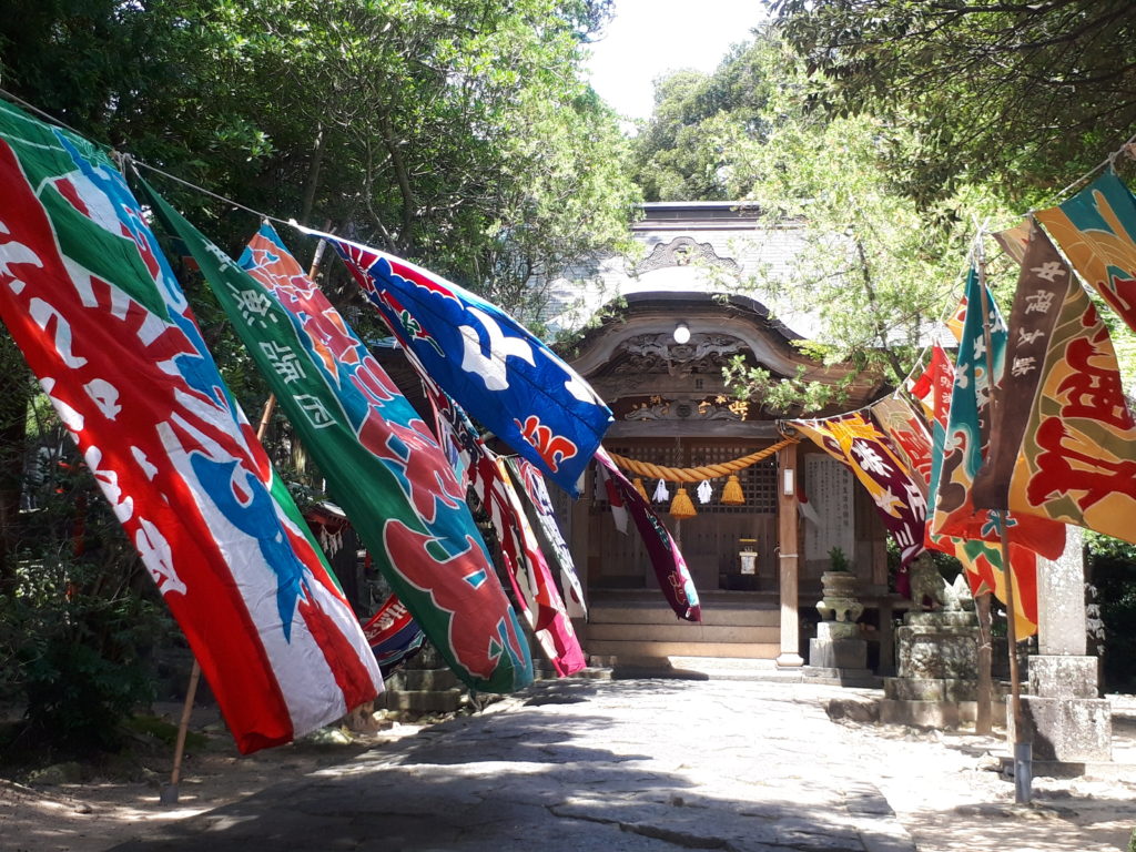 大漁旗が並ぶ参道。厳島神社