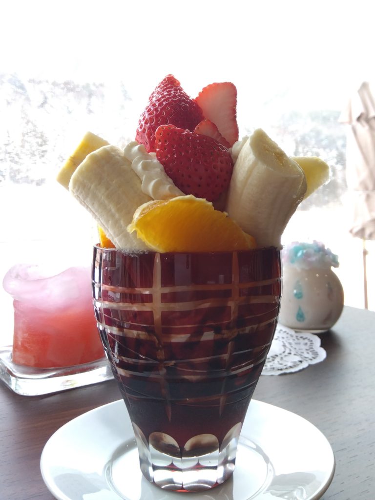 入浴後はほとんど寄り道なしで雪の塩原へ帰ってきて、cafe&candleなないろで少し遅めのランチタイム。運転しながらアップルパイを想像していましたが、「今日はストロベリーパフェがあります」との甘い誘惑があり、カルボナーラの後に満面の笑みを浮かべながらいただきました!ああ、次の休みはスキーに行きたいな。
