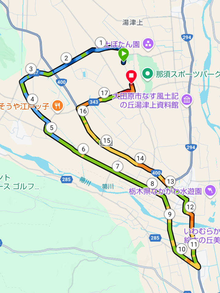 西那須野駅周辺☓、大田原市中心部☓、結局およそ1時間運転して、湯けむりふれあいの丘にたどり着きました。今は便利な時代で、地図サイトを見ながらランニングルートを手軽にイメージできます。おかげでうまい具合に一筆書きで18kmを走ることができました。終始冷たい風にさらされていたので、湯津上温泉やすらぎの湯がとてもありがたかったです。